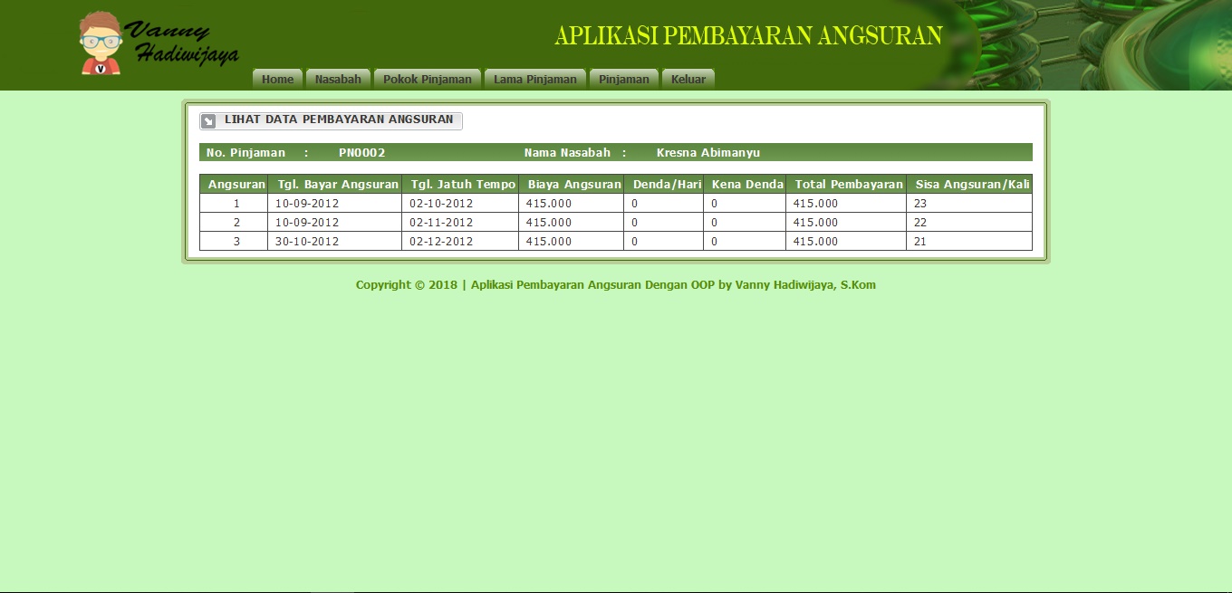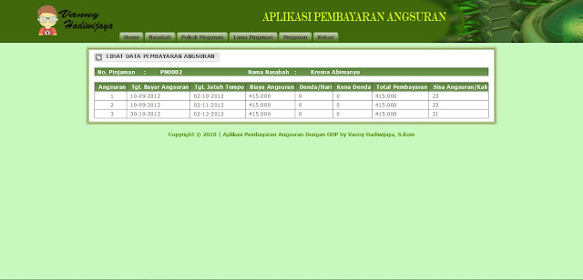 Hallo Saudara , Apa kabar ? Hari ini saya berinisitif share aplikasi lagi , ok langsung saja ke aplikasi nya , saya ingin share aplikasi tentang Sistem Pembayaran Angsuran Metode OOP. Aplikasi ini saya kembangkan menurut Koperasi Unit Desa (KUD) di wilayah Desa Jatisari, Jenggawah, Kota Jember. Saya ingin share aja buat pengetahuan , jika ada yang membutuhkan , bisa langsung di sedot dan di kembangankan bersama.