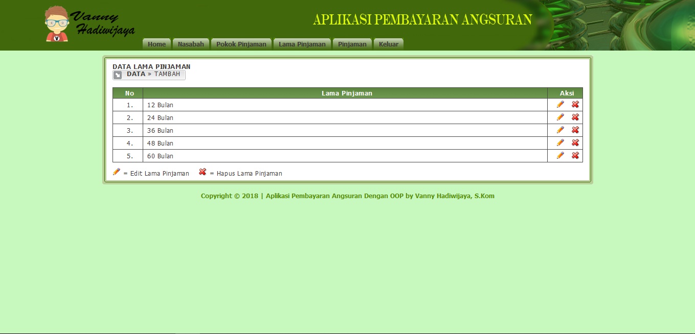 3. Modul Lama Pinjaman, yang berfungsi untuk mengelola berapa lama pinjaman yang boleh dimiliki nasabah (tambah, edit ataupun hapus).