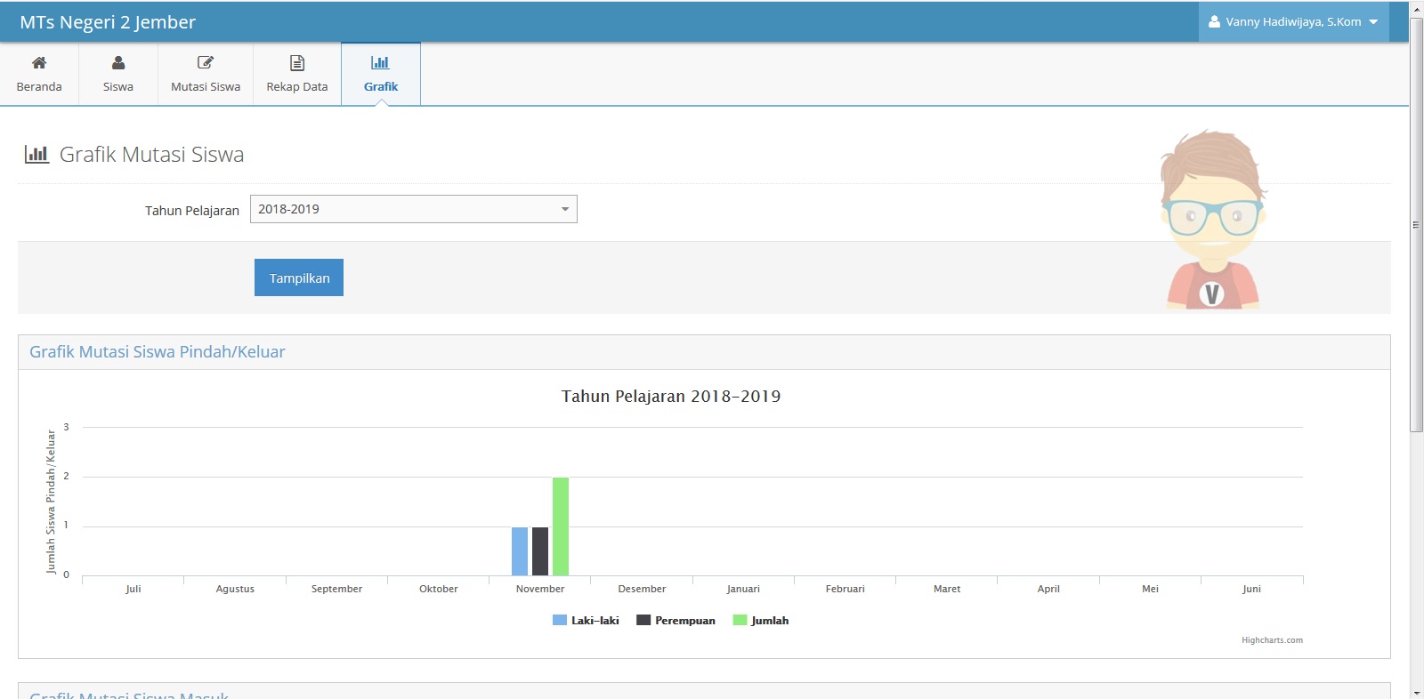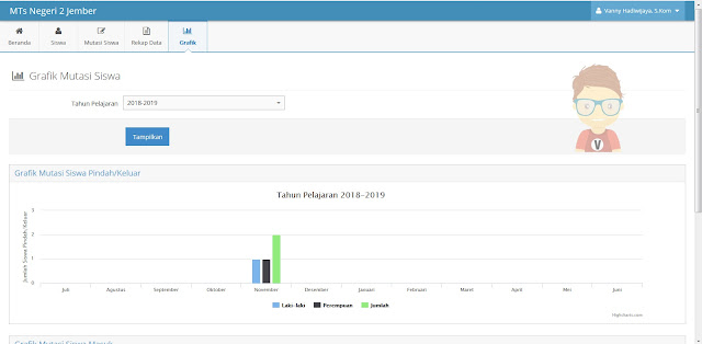 Halaman yang menunjukan informasi mutasi siswa masuk dan mutasi siswa keluar/pindah dalam bentuk grafik per tahun.