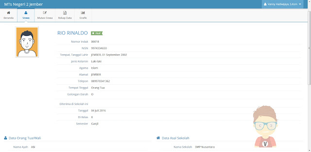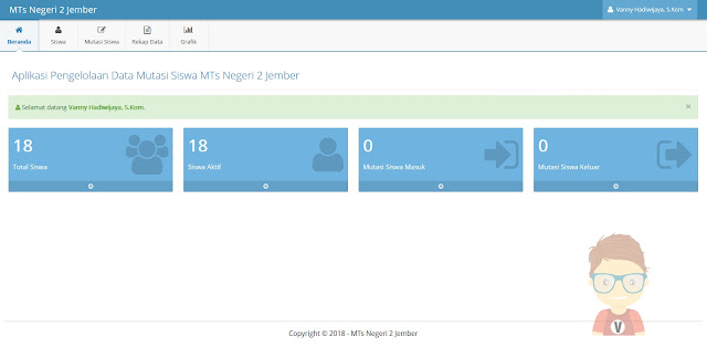 Setelah user berhasil login, maka akan diarahkan ke halaman Beranda. Halaman ini merupakan halaman dashboard yang memberikan informasi jumlah total siswa, siswa aktif, mutasi siswa masuk dan mutasi siswa keluar.