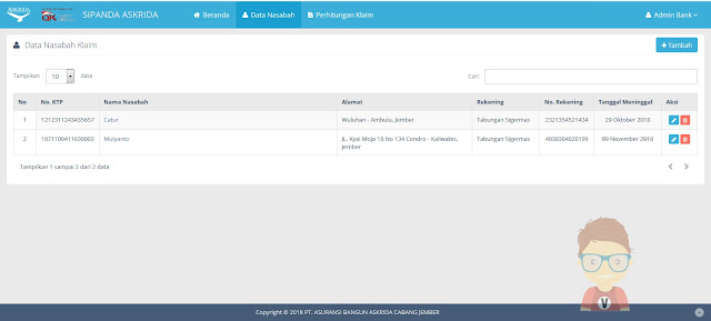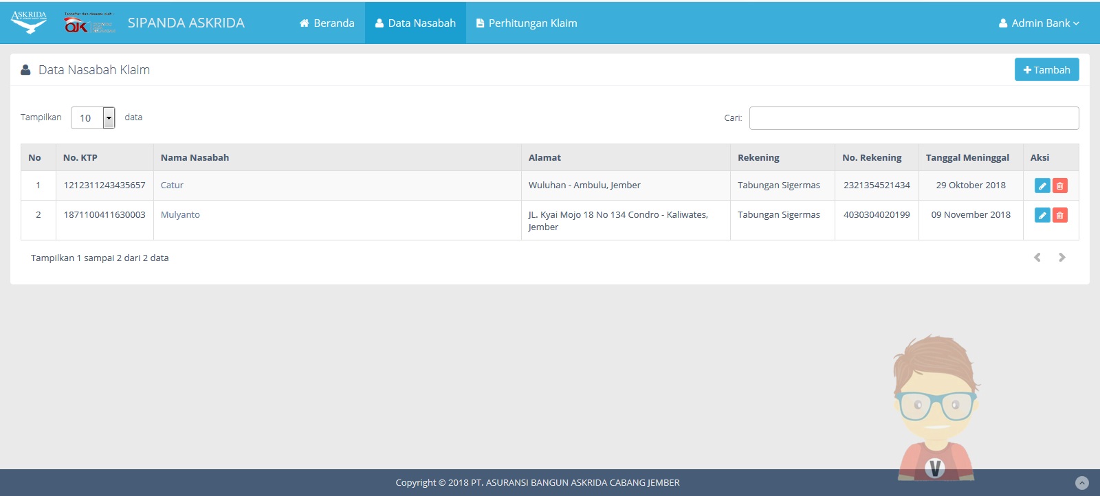 Halaman untuk pengolahan data nasabah yang melakukan klaim. Data nasabah yang melakukan klaim akan diinputkan oleh Admin Bank. Sedangkan Admin Asuransi hanya dapat melihat data yang telah diinputkan oleh pihak bank.