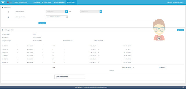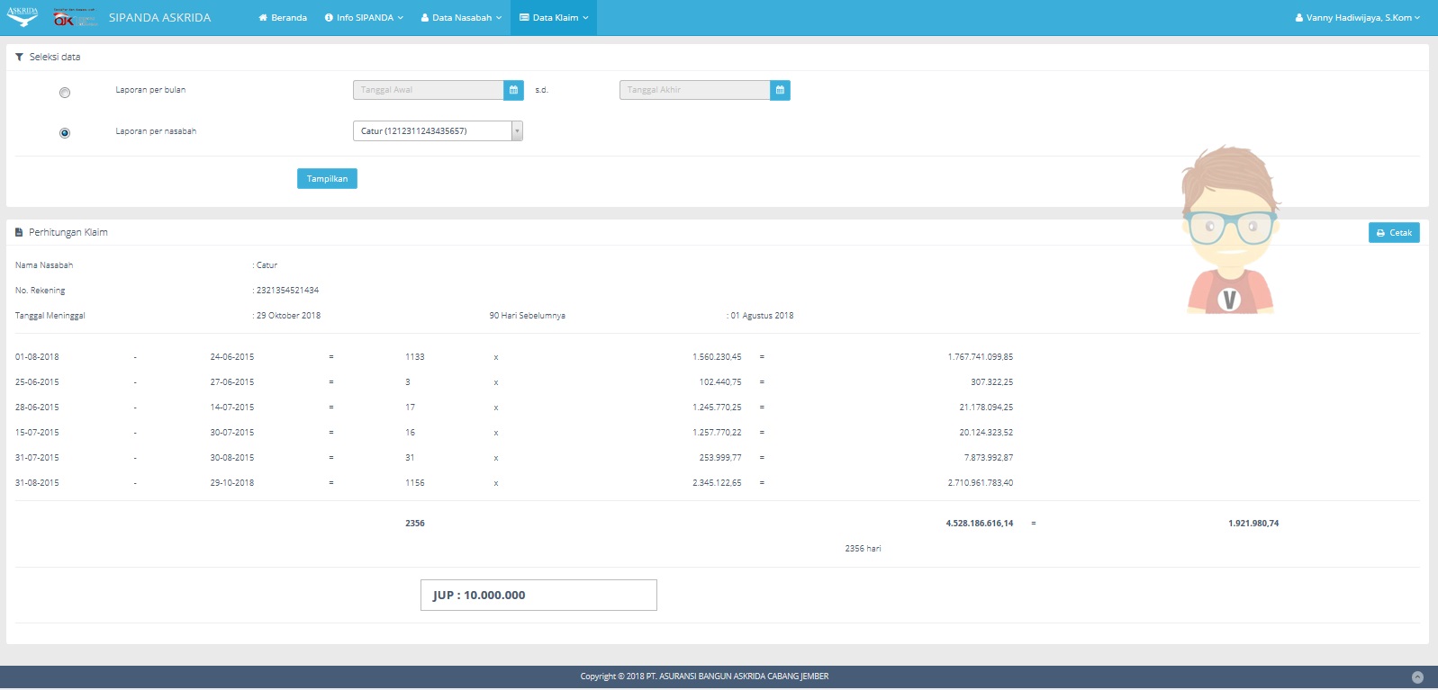 Halaman untuk mencetak laporan hasil perhitungan klaim. Bisa cetak per nasabah untuk mengetahui jumlah uang pertanggungan yang diperoleh masing-masing nasabah, dan bisa cetak per bulan untuk mengetahui jumlah nasabah yang melakukan klaim dan mengetahui jumlah uang pertanggungan yang telah dikeluarkan. Cetak laporan per bulan dan per nasabah bisa dilakukan Admin Bank dan Admin Asuransi. Sedangkan nasabah hanya bisa melihat dan mencetak hasil perhitungan klaim masing-masing nasabah.