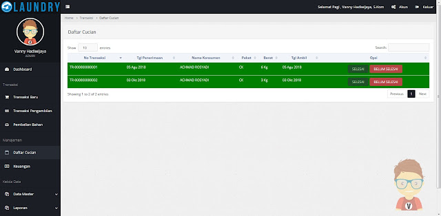 Sistem Informasi E-Laundry adalah aplikasi komputer (perangkat lunak) yang sengaja dibuat dan dirancang sedemikian rupa serta dikembangkan khusus untuk memanagemen bisnis dibidang Laundry. Dengan aplikasi laundry ini masalah-masalah yang sering terjadi dapat teratasi melalui aplikasi ini pengelolaan jasa laundry dapat kita lakukan dengan cepat, akurat, dan efisien. Aplikasi Laundry ini didesain dan dirancang sebagai aplikasi yang User-Friendly. Sehingga, operasional dapat dilakukan dengan sangat baik dan cepat. Untuk lebih jelasnya tentang Sistem Informasi E-Laundry Berbasis Web ini, silahkan lihat screenshoot dibawah.