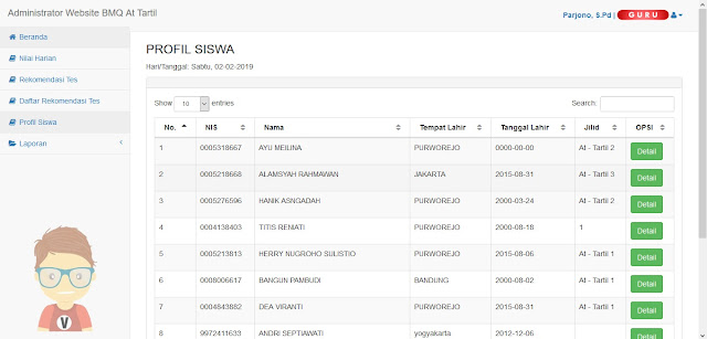 Seiring perkembangan teknologi yang semakin maju, banyak aplikasi-aplikasi berbasis web yang dibuat oleh Web Developers untuk membantu pengguna meringankan dan meng-efisiensikan pekerjaannya. Pada kesempatan kali ini saya akan membahas tentang sebuah aplikasi web yang saya buat untuk membantu para guru ngaji untuk memonitoring nilai siswa yang mengaji di lembaganya. Aplikasi yang akan saya bahas kali ini adalah Sistem Informasi Nilai BMQ Tartil Berbasis Web. Untuk lebih jelasnya seperti apa tampilan dan fitur dari aplikasi tersebut, silahkan lihat screenshoot dibawah.