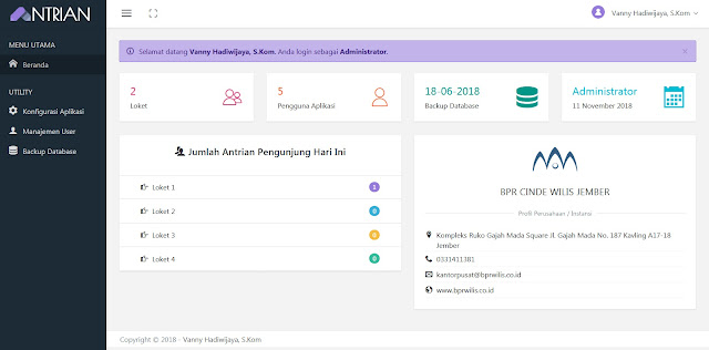 Halaman admin digunakan untuk konfigurasi aplikasi antrian pengunjung. Pada halaman Beranda menampilkan informasi jumlah loket, jumlah pengguna aplikasi, informasi tanggal backup database terakhir, jumlah antrian yang sudah dipanggil pada masing-masing loket, dan profil perusahaan atau instansi. Selain itu juga terdapat menu Konfigurasi Aplikasi untuk mengisikan informasi profil perusahaan atau instansi, Manajemen User untuk mengolah data pengguna aplikasi, dan Backup Database untuk melalukan backup database aplikasi.
